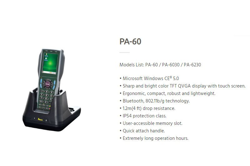 Model List: PT-90 • High-performance CPU adopts Microsoft WinCE 6.0 operating system. • Integrate Bluetooth, WiFi, GPRS/EDGE wireless transmission technology. • Image capture and GPS function and industrial grade IP65 dustproof and waterproof and 1.8 meters falling resistance. • Superior performance and highly reliable product quality.